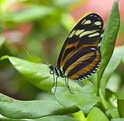 H. ismenius shares the appearance of a number of other similar looking butterflies, of both the same genus[6][7] and other genera (Melinaea, Tithorea) as a member of the "tiger" Müllerian mimicry ring.[7] Various butterfly species that share the trait of being toxic and unpalatable have evolved to share the same aposematic tiger stripe pattern to mutually advertise this protective trait, thereby increasing its recognition among predators.