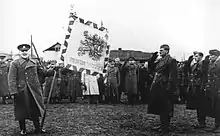 ![]() Brigadier General Heliodor Píka holds the battle flag of the Czechoslovak 2nd Airborne Brigade. | |