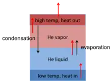 Though seemingly paradoxical, cryogenic helium systems can move heat from a volume of relatively low temperature to a volume of relatively high temperature.[8] Though this phenomenon appears to violate the second law of thermodynamics, experiments have shown this to prevail in systems where the volume of low temperature is constantly heated, and the volume of high temperature is constantly cooled. It is believed this phenomenon is related to the heat associated with the phase change between liquid and gaseous helium.[8]