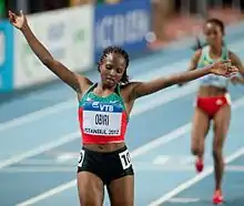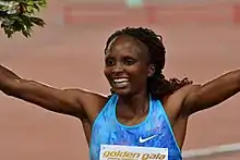 Hellen Onsando Obiri (born 13 December 1989)[1] is a Kenyan middle- and long-distance runner. She is a two-time world champion after winning the 5000 metres in 2017 and again in 2019, when she set a new championship record. Obiri took bronze for the 1500 metres in 2013. She is a two time Olympic 5000m silver medallist from the 2016 Rio and 2020 Tokyo Olympics, where she also placed fourth over the 10,000 metres. She won the 3000 metres race at the 2012 World Indoor Championships, took silver in 2014, and placed fourth in 2018. She holds the Kenyan national records for the mile, 3000 metres both out and indoors, and 5000 metres events.