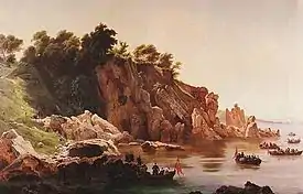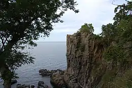 Helligdomsklipperne (Sanctuary Rocks) are a group of rocks on the island of Bornholm, Denmark, 6 kilometres (3.7 mi) from Gudhjem and 4.9 kilometres (3.0 mi) from Tejn.[1] They are characterised by moderately high coastal cliffs of sharp granite and are about 22 metres (72 ft) high.[2][3] The name of the rocks originated in the Middle Ages when there was a holy spring close to the coast which attracted pilgrims, especially on Sankt Hans Aften.[4][5] During the ice age, much of today's coast was below sea level but when the ice melted, the island itself was raised leaving this part of Bornholm's coast some 20 meters above sea level. Coastal cliffs with deep caves and steep craggy granite pillars are typical of this area of the coast as a result of many years exposure to the weather. To the southeast the Kyststi or coastal path leads to the well preserved Døndalen Woods.[6] It is a popular tourist attraction, accessed by boats from Gudhjem harbour. Steps lead from the coast up to the Bornholm Art Museum.[3]