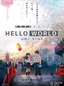 Hello World (Japanese: ハロー・ワールド), stylized as HELLO WORLD, is a 2019 Japanese animated science fiction romantic drama film directed by Tomohiko Itō (in his feature directorial debut) from an original screenplay written by Mado Nozaki. Produced by Graphinica, the film is set in a futuristic Kyoto where a high school student named Naomi Katagaki encounters a person claiming to be himself, who time-traveled from 10 years in the future to save a classmate named Ruri Ichigyō.