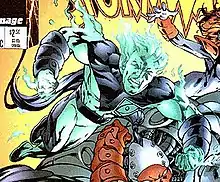 Nigel Keane, also known as Hellstrike, is a fictional comic book superhero in the Stormwatch series, first appearing in Stormwatch #1. He possesses the ability to project plasma as destructive bolts or as an energy stream to allow himself to fly. As of Issue #12, he also has to live inside a containment suit similar to Fuji's.