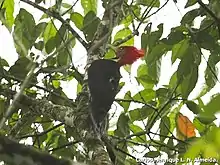The red crest, black back, and barred underside of the helmeted woodpecker resemble those of two larger woodpeckers—the lineated woodpecker (Dryocopus lineatus) and the robust woodpecker (Campephilus robustus)—a form of mimicry which helps prevent attacks by other animals.[6]