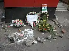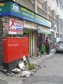 Indian Express quotes statements by Constable Arun Jadhav, who was with the officers Hemant Karkare, Vijay Salaskar and Ashok Kamte when they died.[24] The three officers and four constables had received information that Sadanand Date had been injured in the gunfire at the Cama and Albless Hospital for women and children. Located at Chhatrapati Shivaji Terminus (CST), a ten-minute drive from the hospital,[24] they took a Toyota Qualis and proceeded in that direction. Salaskar was driving, Kamte in the passenger seat, Karkare in the second row, and the four constables, including Jadhav, were in the back row of seating. According to Jadhav, five minutes later, two terrorists stepped out from behind a tree and opened fire with AK-47 automatic rifles. The six policemen, other than Jadhav, were all killed quickly in the gunfire. Kamte was the sole officer who managed to retaliate, wounding terrorist Ajmal in the arm.[25] The wounded Jadhav had no opportunity to render assistance. The two terrorists approached the vehicle, dumped the bodies of the three officers on the road and, leaving the constables for dead, proceeded to Metro Cinema. Upon arrival, they aimed three bursts of automatic fire at the police and press vehicles drawn up at that location, then drove off towards the government offices (Vidhan Bhawan) in South Mumbai. Here again they fired several times. While attempting to leave the area, one of the tires of the vehicle burst, so the terrorists departed to obtain another. At this point, Jadhav was able to contact headquarters. The bodies of the dead were recovered and taken to St George Hospital. However the statement that Kasab fired "inside the car" was rejected by the court.[26] The crucial evidence in Karkare's death - the source of bullet fired into his body was absent. The bullets did not match with few of the terrorist's recovered guns which made it impossible to decide who amongst the terrorists killed Hemant Karkare.[27][28][29] In an investigation, Headline Today, an Indian news agency, found that a substandard bulletproof jacket had been issued to Mr. Karkare. Though, according to the post mortem report, the quality of the vest was not a factor in his death as bullets did not pierce the vest.[30] Concerns in the media about the quality of the vest continue[31] because the vest itself was, according to Indian authorities, misplaced in the hospital.[32] In 2018, the Bombay High Court discarded a pending petition that had claimed that Karkare was not gunned down by terrorists Ajmal Kasab and Abu Ismail.[33]
