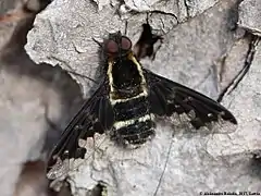 Hemipenthes maurus can reach a body length of about 6–12 mm (0.24–0.47 in).[5] Body coloration is matt black, with black dusting. The spherical head is characterized by a very short snout, not much longer than the mouth. In addition to black scales along the back edge of the compound eyes, golden yellow scales appear in front of the forehead and face. The antennae have an asymmetrically onion-shaped third segment. Behind the head there is a rim of black hair, with golden yellow in the upper part. On the sides of the top of the torso, there are a pair of white or yellowish stripes. The midsection and the shield have long bristles on the edges. These insects can be distinguished from similar species by their wing venation. First of all, Hemipenthes morio, in which the tip of the R1 radial cell is transparent. [5]The wing scales are brownish-white with brown hair on the edges. The wings are blackened on a larger surface is, and the darkening also includes the tops of the radial and discoidal cells. The abdomen has the rear edges of tergites with narrow white bands, except for the fifth tergite, which has a yellowish band on the back edge. [2][6]