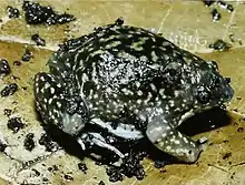 The Guinea snout-burrower (Hemisus guineensis), or Guinea shovelnose frog, is a species of frog in the family Hemisotidae found in sub-Saharan Africa. Its natural habitats are subtropical or tropical moist lowland forests, dry savanna, moist savanna, subtropical or tropical dry shrubland, subtropical or tropical dry lowland grassland, intermittent freshwater marshes, heavily degraded former forests, ponds, and canals and ditches.