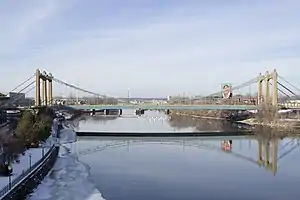 The Hennepin Avenue Bridge is the structure that carries Hennepin County State Aid Highway 52, Hennepin Avenue, across the Mississippi River in Minneapolis, Minnesota, at Nicollet Island. Officially, it is the Father Louis Hennepin Bridge, in honor of the 17th-century explorer Louis Hennepin, who was the first European to see the Saint Anthony Falls, a short distance downriver. Two of the three previous structures have been suspension bridges, while a third—which existed nearly a century—was composed of steel arch spans. The original crossing, which opened as a toll bridge on January 23, 1855, is believed to have been the first permanent span across the Mississippi at any point. Other bridges were completed in 1876, 1891, and most recently 1990. Today, the bridge's main span is 190 metres (620 ft) in length.