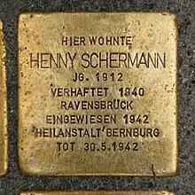 Schermann's life is commemorated with a Stolperstein at the address of her family's shoe shop in Frankfurt.[3] As one of the few lesbian women whose persecution by the Nazi state is documented, there has been an increased interest in her life as historians record and examine the persecution of LGBT communities during the Second World War.