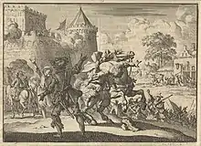 Dampierre was an active commander during the Uskok War, and in 1618 was sent to Bohemia at the head of a hastily raised force to help put down the Bohemian Revolt. In August 1619 he was defeated by Moravian forces in the Battle of Wisternitz. In the same year he raised a regiment of cuirassiers that would become the 8th Bohemian Dragoons, eventually the oldest regiment in regular imperial Austrian service.[1] His men foiled a Protestant attempt to intimidate Ferdinand II into making concessions by storming the Hofburg Palace. Sent to prevent Gabriel Bethlen from linking up with the Bohemian rebels, Dampierre died of his wounds on 8 October 1620, after leading an unsuccessful assault on Bratislava Castle.[1]