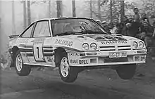 Toivonen continued with Opel into the 1983 season, now driving the Manta 400, which took advantage of the new Group B regulations. Although the Manta was a Group B car, it was underpowered against the likes of the Audi Quattro A2 and Lancia 037, which were controlling the world rally scene at the time. Toivonen achieved a win at the Manx International Rally, a round of the British Open Rally Championship and the European Rally Championship, in the Isle of Man, at his first attempt. He also finished first at the Mille Pistes rally in France, but the organisers decided to ban the Group B cars halfway through the event. Toivonen and his co-driver, Ian Grindrod, received only a consolation trophy.[4] In the World Rally Championship, he retired in three rallies, finished sixth at the Monte Carlo Rally and fourth at the Rallye Sanremo.[7] He also drove a Ferrari 308 GTB at the San Marino Rally, where he was co-driven by Juha Piironen for the first time. The pair retired from the event, but Piironen would become his main co-driver for the next two seasons, and later have a long and successful partnership with four-time world champion Juha Kankkunen.[25] In late October, Toivonen again competed on the circuits. This time he entered two sportscar races, driving a Porsche 956 for Richard Lloyd Racing in the European Endurance Championship. He only practiced the car at Imola and did not race, but in the next race at Mugello, partnered with Derek Bell and Jonathan Palmer, he finished third.[26]