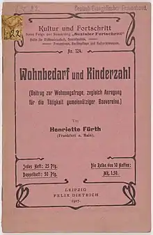 Henrietta Fürth represented that part of the proletarian women's movement that was oriented towards the SPD.[7] As early as 1896, she distanced herself from the formidable Clara Zetkin when she rejected the ideal of a separation between the "bourgeois" and "proletarian" women's movements.[8][9] Her own economic situation was conventionally middle class: for a time the Fürths employed two household servants. However, as her husband's leather wholesaling business declined and then, in 1901, went bankrupt she had to go out to work, first as a housing inspector and later as a paid secretary with the "Israelitische Hilfsverein". She was subsequently employed as a journalist and in public relations work for the National Private Welfare Centre ("Zentrale für private Fürsorge", as it was then known). Around this time she also teamed up with Bertha Pappenheim, founding the "Weibliche Fürsorge" to work on women's welfare issues, but, on account of "considerable differences" between the two women, little "fruitful collaboration" came of the partnership.[2]