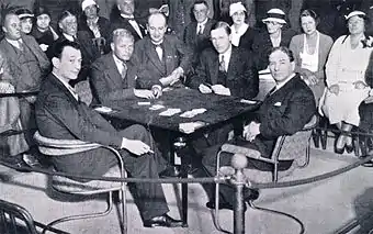 The first match, Crockford's v. Culbertson, took place in 1930, after the Buller–Culbertson match. The Crockford's team was Beasley, Sir Guy Domville (popular society and sporting figure), George Morris and Captain Hogg. Culbertson won the match over 200 deals by 4,905 points (total points scoring).[7]