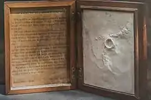 The framed model says 1851…It may have been replicated for the 1851 world exposition. transcribed from the noted publication (5)...under notices and abstracts, in 1850: On a Model of the Moon's Surface, By Henry Blunt. This model is an accurate representation of a part of the moon's surface as it appears through a Newtonian telescope of seven feet focus and nine inch aperture, under a magnifying power of about 250. The large volcanic crater, which forms the principal object in the model, has received the name of Eratosthenes. It is about thirty miles in diameter and stands at the end of a lofty range of mountains not far from the centre of the moon's disc. A hilly district, rising into two or three lofty peaks, runs upwards from Eratosthenes, connecting it with what appears to have been an ancient crater now filled up. Touching the edge of this crater and descending from it towards the right, may be seen a long line of minute volcanic cups, which are nearly the smallest objects visible with the instrument by which the observations were made. The whole is represented as seen with an inverting eye-piece, and the model ought to be held in an oblique light in order to view it to advantage.