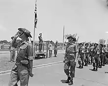 ![]() Lieutenant General Sir William Slim (GOC-in-Chief 14th Army, left), Air Vice Marshal Stanley Vincent (AOC 221 Group South East Asia Air Forces, centre) and Major General Henry Chambers (GOC 26th Indian Division, right) at Government House, Rangoon, 8 May 1945. | |