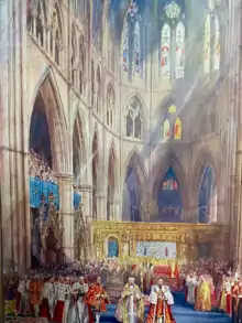 No pictures by Brewer appear in the Royal Collection Trust (unlike those of his father Henry William Brewer, who was commissioned by Queen Victoria and is represented by 26 pictures in the Collection). Nevertheless, Brewer holds a significant place in Royal art. He undertook a number of paintings of the George VI's Coronation Ceremony in 1937, five of which were reproduced as large coloured plates in 'The Illustrated London News Coronation Record Number George VI & Queen Elizabeth' of the same year.[9]