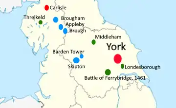 Clifford made a natural ally for King Henry, and soon became one of his most trusted men in the north.[50] Summerson suggests that Henry had little choice in restoring Clifford to his traditional regional position, as Northern England had been firmly Yorkist for over 20 years, first under the Nevilles and then under Gloucester. The latter had made Yorkshire his powerbase.[1] Clifford, already loyal to Lancaster and then Tudor, was an obvious choice to act as the King's man, and Henry gradually increased Clifford's power. On 2 May 1486[54] Clifford received the stewardship of the Lordship of Middleham and bailiwick of the Honour of Richmond.[1] The former had been one of Richard of Gloucester's most important headquarters.[55] After Richard took the throne, he granted it to Sir John Conyers,[54] one of Gloucester's closest advisers;[56] both Middleham and Richmond had been Neville strongholds before that.[57] Conyers seems to have been placed in Clifford's custody around this time, although relations between the two men seem to have improved: Clifford later jointly shared in a £1,000 bond to the King for Conyers's good behaviour.[58] In October 1486 Clifford sat on a commission to "levy for the King, all profits arising from the King's manors and lands in the counties of Westmorland and Cumberland, the lordship of Penrith and the forest of Inglewood" in expectation of an invasion by Scotland.[59]