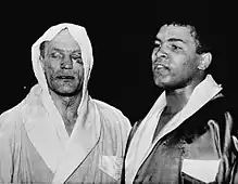 In 1963 Muhammad Ali (then known as Cassius Clay and a contender for the world heavyweight title) created a great deal of ticket-selling publicity before his London bout with Cooper, who many British fans hoped would be able to humble the brash young American. In the boxing world, however, Ali was considered a future world champion and Cooper the underdog. The contest took place at Wembley Stadium, Wembley Park. According to the official weigh-in, Ali outweighed Cooper by 21 pounds, Cooper said he wore weighted clothing and was near the light heavyweight limit.[7] Cooper had devised his own training regimen and felt that though lighter he was in the best condition of his career.[7] Ali's size, mobility, fast reflexes, and unorthodox defensive tactic of pulling back from punches made him a frustratingly elusive opponent, and Cooper was later accused by Ali's camp of hitting on the break.[7] With hardly any attempt at effective aggression by Ali, Cooper was leading on points, but during the fourth round had connected with a solitary left hook to the body; in the fourth's final seconds, Cooper felled Ali with an upward angled version of his trademark left hook to the jaw, "Enry's 'Ammer".[7] Ali partly landed on the ropes, preventing his head hitting the canvas covered boards, but though up at the count of 3 he seemed hurt.[7]In the corner Dundee was angry and slapped Ali's legs. Ali misunderstood and tried to get off the stool. It has been claimed that Dundee may have used smelling salts to revive Ali. This has never been confirmed and the film is unclear if this happened. The use of smelling salts was prohibited in British boxing, and their use would have led to Ali losing by disqualification if the offence was proved. Dundee later said that he put his finger in a small tear in one of Ali's gloves to demonstrate to the referee and told the referee that his fighter needed replacements, but none were available. Cooper insisted that resulted in a delay of a minute or more in addition to the regulation time between rounds, and denied him a chance to finish off Ali while he was still dazed. A tape of the fight showed an interval extension of only an extra six seconds.