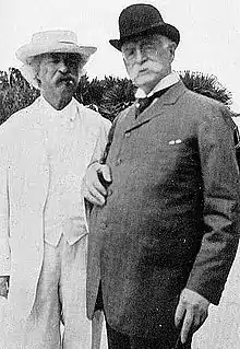 Rogers and Twain enjoyed a more than 16-year friendship. Rogers' family became Twain's surrogate family, and he was a frequent guest at the Rogers townhouse in New York City. Earl J. Dias described the relationship in these words: "Rogers and Twain were kindred spirits—fond of poker, billiards, the theater, practical jokes, mild profanity, the good-natured spoof. Their friendship, in short, was based on a community of interests and on the fact that each, in some way, needed the other."[12] Their letters were published as Mark Twain's Correspondence with Henry Huttleston Rogers, 1893–1909,[13] They had a standing joke that Twain was inclined to pilfer items from the Rogers household whenever he spent the night there as a guest. Two letters provide an illustration. Twain wrote to Anne Rogers that he had packed: