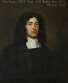 Henry James was the son of Henry James, a Somerset vicar and chaplain to the Bishop of Bristol.[1] He was schooled at Eton College, and was admitted to Magdalene College, Cambridge in 1660, but transferred to Queens' College, Cambridge in August 1661, graduating B.A. 1664, M.A. 1667, B.D. 1675, D.D. 1679 (per lit. reg.).[2]