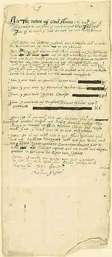 Both Henry and Persida's wills mention their five children: Sarah, Margaret, John, Helena and Richard, all of whom were baptised in Holt between 1598 and 1608.[3] Henry's will mentions one illegitimate child among his beneficiaries - "John the Cuthbert".[2] Genealogical research has revealed 8 children, 32 grandchildren, and over 70 great-grandchildren descended from Jetto.[6] Jetto's will contains a threat towards two of his more unruly children, Richard and Margaret, over their portions of the inheritance:[2]