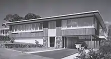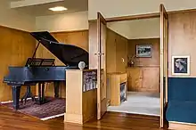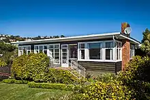 Privately, Kulka realized over 40 fine wooden houses throughout New Zealand. His wooden houses were innovative in their spatial and material resolution. The Halberstam House in Wellington (1948)[16] is an excellent example of Kulka's ability to design compact minimal dwellings. The single level bungalow sits on top of a small hill in Wellington. It had a very modest construction budget and post war building restrictions were imposed on the commissioners. Notwithstanding these constraints, Kulka built a striking cubic bungalow clad with dark stained weather boards on the exterior with the uplifting surprise of a luminous and calming interior consisting of fine honey coloured native wood panels and clean fibrous plaster. In this modest sized family home a small piano nook is built subtly into the lounge. This nook is separated from the main body of the lounge by the minimal gesture of a bookcase which projects a little into the lounge.[17] A small lowered ceiling above the nook adds to the sense of separateness, snugness of this sub-space. Built in seating on either side of a fireplace are positioned toward the view of northerly hills, and the light. Cosiness, economy and functionality are brought together to achieve a sense of gentle refinement. Notwithstanding the Halberstam villa's more modest scale compared to other Kulka Houses in New Zealand, it remains exemplary of the spirit of his work spatially and materially. Kulka's prolific building continues to influence Modern Architecture in New Zealand.