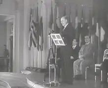 At the Second Quebec Conference on September 16, 1944, Roosevelt and Morgenthau persuaded the initially very reluctant British Prime Minister Winston Churchill to agree to the Morgenthau Plan, likely using a $6 billion Lend-Lease agreement to do so.[25] Churchill chose however to narrow the scope of Morgenthau's proposal by drafting a new version of the memorandum, which ended up being the version signed by the two statesmen.[25] The gist of the signed memorandum was "This programme for eliminating the war-making industries in the Ruhr and the Saar is looking forward to converting Germany into a country primarily agricultural and pastoral in its character."