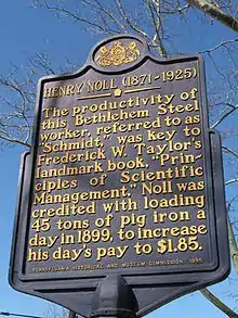 Noll came to public attention in the writing and speaking of 'scientific management' proponent Frederick Winslow Taylor. In Taylor's Principles of Scientific Management, he describes a study conducted at Bethlehem Steel in 1898 regarding the loading of pig iron onto railroad cars.[1] At the start of the study, workers were loading an average of 12.5 tons of pig per laborer per day and received a wage of $1.15 per day, regardless of individual output. The Bethlehem Steel management wanted to increase workers' output and shift to a piece-rate wage of $.0375 per ton. Under the target piece-rate, workers would have to load more than 30 tons per day (or 250% of the current output) to earn the same wage. Two of Taylor's employees worked at the Bethlehem Steel plant, experimenting with loading strategies and searching out exemplary workers to serve as models for the assertion that "a good day's wages could be made at the existing rates by a good man".[2]