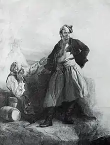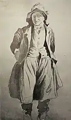 In 1826 Shipwrecked Smugglers was exhibited at the Royal Academy,[26] where it was purchased by Sir Matthew White Ridley, 3rd Viscount Ridley and MP for Newcastle.[27] Its elements of melodrama, nostalgia and romanticism were careful judged so as not to offend notions of good taste. Parker returned to the similar subject matter regularly over the next thirty years: Smugglers Attacked; Smugglers Alarmed; Smugglers Playing Cards; An Affray with Smugglers; Smugglers Resting and Smugglers Quarrellin'. ‘Smuggler Parker’ became a nickname and a marketing strategy – the paintings sold well. He embraced the role – dressing as a brigand at a fancy-dress ball and telling many stories about smugglers, which ‘greatly delighted the boys in his drawing classes.'[28]
