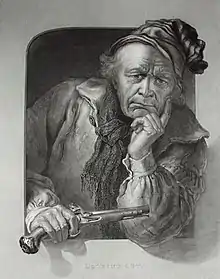 ‘Being a young man of good address and prepossessing appearance and developing a vigorous and taking style of painting figure subjects, Mr. Parker received from the people of Tyneside flattering encouragement and support.'[9] Eccentric Characters of Newcastle (aka Hell’s Kitchen),[10] from about 1817, was one of Parker’s best-known early paintings. It shows fourteen ‘eccentrics’ – locally known characters, mainly paupers from the streets of the Quayside area of Newcastle – assembled in the Flying Horse drinking house. The painting was bought for 20 guineas by Charles John Brandling (1769–1826), an influential landowner and coal magnate.