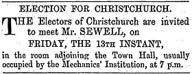 Sewell's diary, published in 1980 as the Sewell Journal in two volumes, gives a unique insight into his life in the colony. The journal's editor, historian W. David McIntyre, calls it "the most absorbing and undoubtedly the fullest private manuscript relating to New Zealand in the 1850s".[5] In late July 1853, Sewell decided that he would stand for Parliament in the 1853 general election; the question was whether he should run in the Town of Christchurch or the Christchurch Country electorate.[6] There was one position to be filled in the town electorate, and two in the rural electorate.[7] Sewell sought counsel from some friends, who recommended for him to stand in the rural electorate, but he did not want to oppose Guise Brittan, who had already declared his candidacy. Whilst Brittan was unpopular with the constituency, Sewell thought that it would be useful to have him in Parliament. The complication with the town electorate was that John Watts-Russell had already received a pledge from the majority of that constituency, but there were rumours that he would not stand, and it was known that he was just about to go travelling during the time of the election campaign.[8] Sewell talked to Brittan, who fully supported him standing in the town electorate, and Brittan pledged that he would get his brother-in-law, Charles Fooks, to canvas for him.[8] Sewell first advertised his candidacy in the Lyttelton Times on 30 July.[9] In the same edition of the newspaper, James Stuart-Wortley[9] and Guise Brittan[10] advertised their candidacy for the Christchurch Country electorate. Jerningham Wakefield reiterated his candidacy for the Christchurch Country electorate in early August upon his return from Wellington.[11] At the same time, Fooks announced his candidacy for the Town of Christchurch electorate.[11] With James FitzGerald, who had just been elected the first Superintendent of the Canterbury Province, apparently in support of Watts-Russell, Sewell decided to withdraw from the contest, but decided to go ahead with a public meeting to 'speak his mind'.[12] On 4 August,[13] he held a meeting at the Golden Fleece, a hotel on the corner of Colombo and Armagh Streets,[14] and addressed between 30 and 40 electors. He discussed all the issues that Parliament should deal with, but finished by saying that he would not be available as a candidate, as Watts-Russell had been pledged the support of the constituency. After an awkward period of silence, Richard Packer stood up and replied:[15]