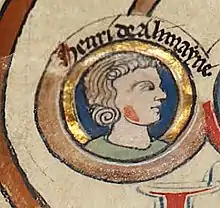 Henry of Almain (Anglo-Norman: Henri d'Almayne; 2 November 1235 – 13 March 1271), also called Henry of Cornwall, was the eldest son of Richard, Earl of Cornwall, afterwards King of the Romans, by his first wife Isabel Marshal.[2][3] His surname is derived from a vowel shift in pronunciation of d'Allemagne ("of Germany"); he was so called by the elites of England because of his father's status as the elected German King of Almayne.[4][5]