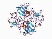 Hepatocyte growth factor has been shown to interact with the protein product of the c-Met oncogene, identified as the HGF receptor (HGFR).[6][32][33] Both overexpression of the Met/HGFR receptor protein and autocrine activation of Met/HGFR by simultaneous expression of the hepatocyte growth factor ligand have been implicated in oncogenesis.[34][35] Hepatocyte growth factor interacts with the sulfated glycosaminoglycans heparan sulfate and dermatan sulfate.[36][37] The interaction with heparan sulfate allows hepatocyte growth factor to form a complex with c-Met that is able to transduce intracellular signals leading to cell division and cell migration.[36][38]