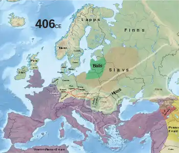 Attalus did not initially send an army to Africa against Heraclianus, as it would have to have been under Visigothic lead.[8] Deceived by false prophecies or moved by his own jealousy of the Visigoths, he sent a lone representative, Constans, counting on his authority alone to depose Heraclianus or convince the provincials to rebel.[9] However, Constans was killed,[10] and Heraclianus sent Honorius the great sum he had confiscated from the envoys, intended to bribe the local population.[11] Alaric wanted to send an army against Heraclianus under the command of his own man Drumas. But Attalus opposed this, and Alaric deposed him in 410.[12] As Alaric intended to send a rather small army of only 500 men, it is probable that Heraclianus had only a very small force at his own disposal. However, it is also probable that Heraclianus had the support of the local population, as Emperor Honorius had recently issued a tolerance edict in favour of the Donatists, a Christian sect very popular in Africa.[13] According to the historian Adrian Goldsworthy, Attalus sent a Roman commander with regular troops to secure the province of Africa, but these were seriously defeated by the Roman troops of Heraclianus, who for the time being remained loyal to the Emperor Honorius.[14]