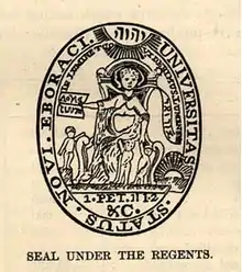 The College is represented by a Lady sitting in a Throne or Chair of State, with Severall Children at her Knees to represent the Pupils, with I Peter II., 1, 2, &c., under them to express the Temper with which they should apply Themselves to seek for True Wisdom... One of the [New-born Babes] She takes by the hand with her left hand expressing her benevolent design of Conducting them to true Wisdom and Virtue. To which purpose She holds open to the a Book in her right hand in which is [in] Greek letters "λόγια ζῶντα", the living or lively Oracles, which is the Epithet that St. Stephen gives to the Holy scriptures—Acts. 7:38. Out of her Mouth over her left Shoulder goes a Label with these words in Hebrew Letters ori-el [אוּרִיאֵל], God is my light; alluding to Ps. 27:1. expressing her Acknowledgment of God the Father of Lights, as the Fountain of all that Light, both Natural and Revealed with which She proposes to enlighten or instruct her Children or Pupils; whereof the Sun rising under the Label is the Emblem or Hieroglyphic, alluding to that expression Mal. IV, 2., The Sun of Righteousness arising with healing in his Wings. Over her head is Jehovah [יהוה] in a Glory, the Beams coming triangularly to a Point near her head, with these words around her for her motto, In Lumine Tuo Videbimus Lumen—In thy light shall we see light Ps. 36:9. On the Edge around are engraved in Capitals, Sigillum Collegii Reg. Nov. Ebor. in America—The Seal of King's College at New York in America.[1]