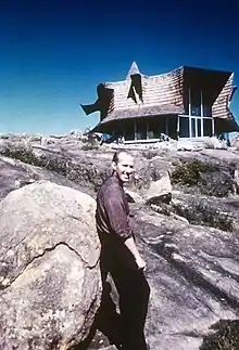 In 1957, Greene returned to the University of Oklahoma, where he and his colleagues, Bruce Goff and Mendel Glickman (1895–1967), among other faculty, developed the American School of architecture, a curriculum that emphasized individual creativity, organic forms, and experimentation.[4] Donald MacDonald, an architect who trained under Greene and Glickman, described the American School as “a truly American ethic, which is being formulated without the usual influence of the European or Asian architectural forms and methodologies common on the East and West coasts of the United States.”[5] Students were taught to look to sources beyond the accepted canon of western architecture and to find inspiration in everyday objects, the natural landscape, and non-western cultures such as the designs of Native American tribes of Oklahoma and the Western plains.[6] Mickey Muennig was one of Greene's students.[7]