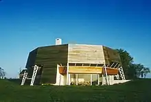 Greene realized the completion of his building, The Prairie House, in 1961, a structure that pre-dated the green building movement by a decade.[8] Located in Norman, Oklahoma, this modernist residence, integrates concepts that are now associated with smart architecture: natural materials, passive design, natural lighting and ventilation, energy efficiency, and careful site placement.[9] Julius Shulman photographs of The Prairie House were featured in Life and Look magazines, in addition to several international publications. This media exposure brought Greene recognition for his experimental architecture and counter-culture design philosophy.[8][10]