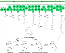 Biosynthesis of herboxidiene has been studied for over 20 years since its discovery. The precursor of herboxidiene, 18-deoxy-25-demethyl herboxitriene was first synthesized in Streptomyces chromofuscus through a nine-modules PKS I pathway. 18-deoxy-25-demethyl herboxitriene is then epoxidized by enzyme HerE on the carbon carbon double bond between C14 and C15, oxidized by enzyme HerG on C-18 and eventually methylated by enzyme HerF on C25 to herboxidiene with the help of cofactor SAM.[5]