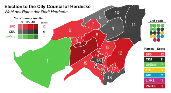 The Herdecke city council governs the city alongside the Mayor. The most recent city council election was held on 13 September 2020, and the results were as follows: