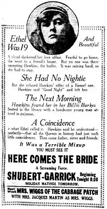 Here Comes the Bride is a lost[1] 1919 American silent comedy film produced by Famous Players-Lasky and released by Paramount Pictures. This film is based on the 1917 Broadway play Here Comes the Bride by Max Marcin and Roy Atwell. The film was directed by John S. Robertson and stars John Barrymore.[2][3][4][5][6][7]