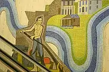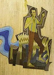 Here I Grew Up is a mosaic mural on a travertine marble wall that measures 70 ft. in length and 25 ft. in height.[1] It contains over 300,000 hand-cut pieces of Bysantine Smalti (Glass tiles) in 87 different hues.[1] These tiles measure approximately 3/8" x 5/8" x 1/9" thick[1] and were imported from Murano, Italy. The design for the mural was chosen as a winning entry for an art competition held in December 1959, by the Indiana State Office Building Commission.[2] Antreasian's mural entry, along with Young Abe Lincoln (sculpture) by David Rubins, was selected by a jury to commemorate Abraham Lincoln's formative years in Indiana.[1] Antreasian's full-scale color drawings of the Abraham Lincoln figures took six months to complete.[3]