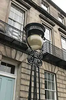 The street lighting appears authentic but has a complex history. The original lights were added in the 1860s (sixty years after construction) to a design by John Kippen Watson FRSE. The lights were removed and replaced by conventional electric street lighting but restored as an electric version of the original gas-lamps using moulds made by the Edinburgh New Town Conservation Trust in the early 1980s.