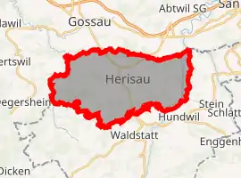 The municipality is located in the former District of Hinterland. It is located at the crossing point of two major routes through the region, the St. Gallen-Toggenburg road and the Gossau-Appenzell road. In addition to being the capital of the half canton, about one-third of the population of the entire half canton lives in Herisau.[4] It consists of the village of Herisau and scattered hamlets as well as bedroom communities and industrial sections. Before 1648 it controlled about twice the land area as is currently part of the municipality. Until 1648 Schwellbrunn was part of the municipality and until 1720, Waldstatt was part of Herisau.