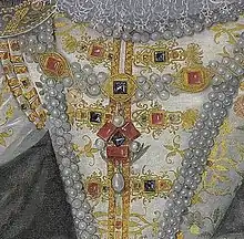 Detail of painting showing Queen Elizabeth I wearing Ruissel's most famous piece, the Three Brothers