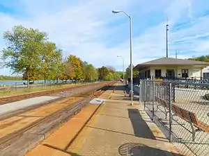A rebuilt station was approved for construction in 2006 and opened on September 12, 2014.[1] The one story depot features a random rubble stone veneer base, walls clad in traditional clapboard siding and a hipped roof. The waiting room is trimmed in bead board wainscoting, and there are also accessible restrooms. Displays trace the area's transportation history, with a focus on the Missouri River, railroads and roadways. Funding for the project came through the Federal Highway Administration's Transportation Enhancements program, the city of Hermann and the Dierberg Educational Foundation, a local non-profit organization that supports projects to preserve the region's cultural heritage.[5]