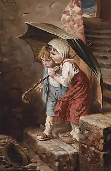 Kaulbach was the son of painter Wilhelm von Kaulbach. He was originally a medical student at the Ludwig Maximilian University of Munich but, perhaps inspired by his father, quit school to study painting instead. In 1867, he became a student of Karl von Piloty. Under his influence, Kaulbach devoted himself almost entirely to historical themes. Ultimately though, he became best known for his portraits of children. He made two study trips to Rome, in 1880 and 1891. In 1886, he was appointed a Professor of History Painting at the Academy of Fine Arts Munich.[1] In 1906 he published a picture book, with children as the motif, that sold 135,000 copies.
