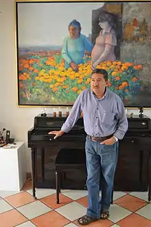 However his stepfather opposed Sosa's artistic ambitions and eliminated his chances of entering the National School of Arts (ENAP) in 1967 by destroying needed documents in Sosa's face.[2][3] So a few weeks later, Sosa took a painting class at the Casa del Lago, an institution supported by the National Autonomous University of Mexico. Here he learned the basics of composition, working during his free time and on any material from napkins to actual canvas.[7] The teacher of this class, José Rivera, arranged to allow Sosa to attend an ENAP class as an unmatriculated student with Fermín Rojas, and Sosa participated in an exhibition with the class. Rojas recognized the young man's talent and encouraged him to continue his studies.[8] However, Sosa could not continue at the school because of his lack of credentials.[9]