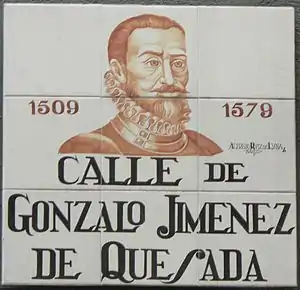 Hernán Pérez de Quesada was born around the year 1512 in the Andalusian city of Granada as second son of Gonzalo Jiménez and Isabel Jiménez de Quesada.[1][2][3] His family was Catholic, but descended from marranos (Sephardi Jews).[14] His elder brother was conquistador Gonzalo Jiménez and he had four other siblings; brother Melchor, Francisco, who also was conquistador in Peru, and sisters Magdalena de Quesada and Andrea Ximénez de Quesada.[3][4][5] Hernán also had a half-sister; Isabel de Quesada.[6] In 1535, arriving early 1536, the brothers Gonzalo, Francisco and Hernán sailed from Spain to Santa Marta, one of the first cities founded in modern-day Colombia, by Rodrigo de Bastidas in 1525.