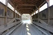 Herns Mill Covered Bridge is a historic covered bridge near Lewisburg, Greenbrier County, West Virginia. It was built in 1884,[2] and is a Queen post truss bridge measuring 10 feet, 6 inches wide and 53 feet, 8 inches long. It has red board-and-batten siding and a galvanized sheet metal roof. It was built to provide access to the S.S. Hern Mill, when it was in operation. It is one of two remaining covered bridges in Greenbrier County, the other being Hokes Mill Covered Bridge.[3]