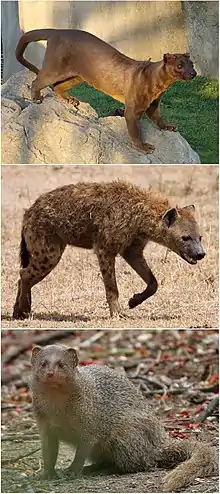 | Top to bottom: Fossa, spotted hyena, Indian grey mongoose | |